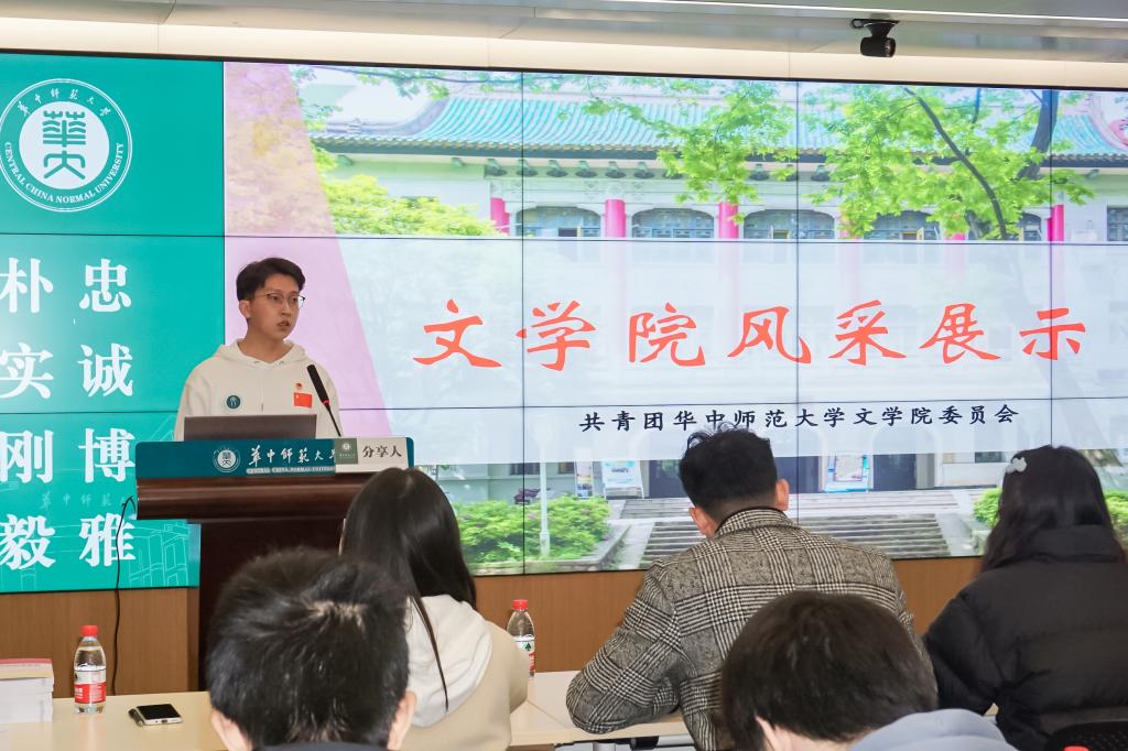 随后,文学院团委副书记(学生)马万鹏在“展现一院风采”环节从团情概况、育人工作、未来展望三方面,向各兄弟学院展示了文学院团委的工作成效、特色做法与机制建设,重点介绍了“求木之长者,必固其根本”的思想育人、“欲流之远者,必浚其泉源”的文化育人、“觉纸之浅者,必躬其行止”的实践育人等工作经验。