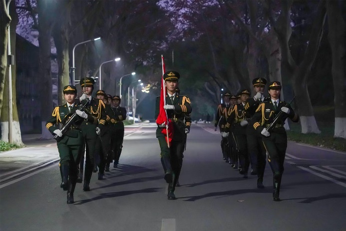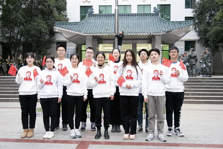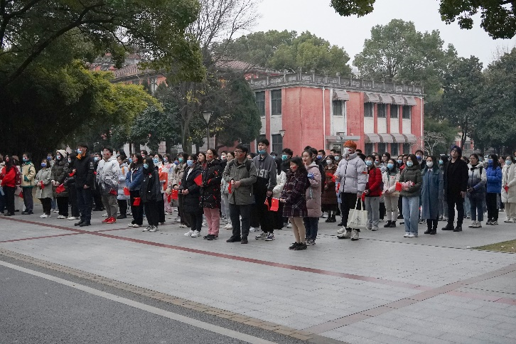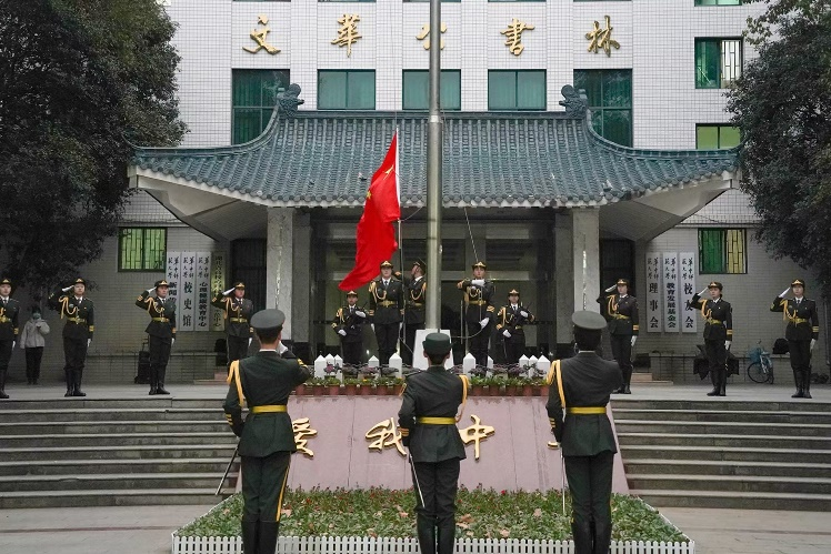 清晨6时40分许,国旗护卫队在文华公书林前集合完毕。仪式开始前,恽代英菁英学校学员为前来参加升旗仪式的师生们发放红旗贴纸、手持红旗等充满节日特色的物品,进一步营造节日氛围。