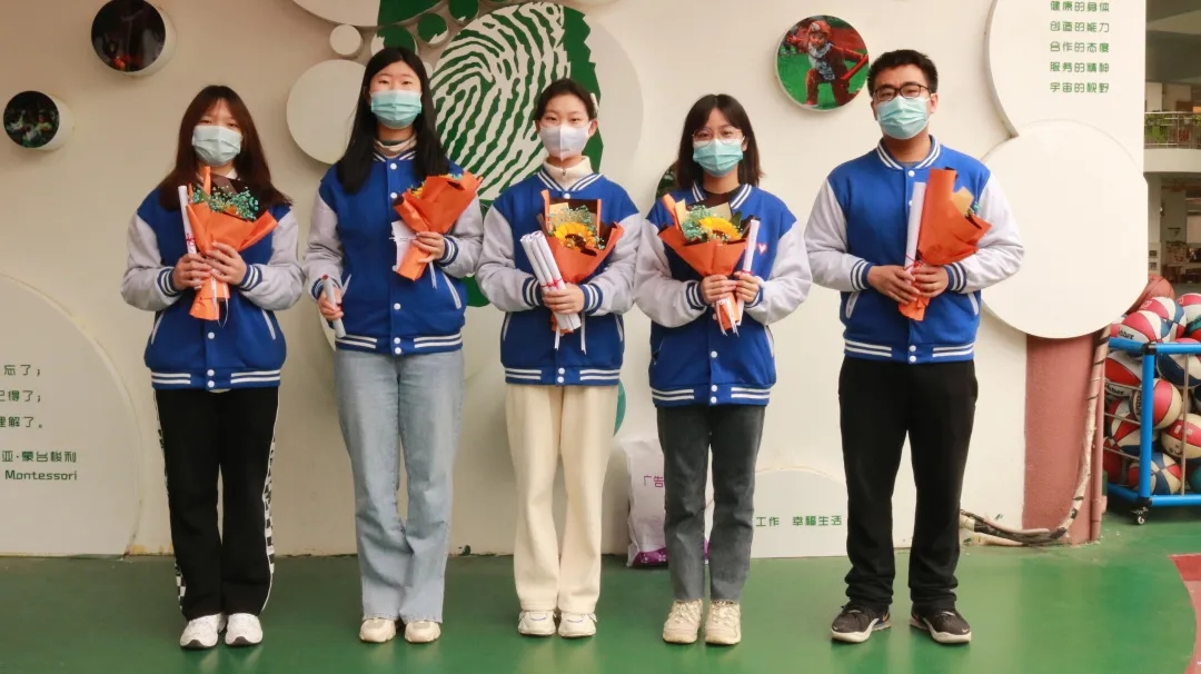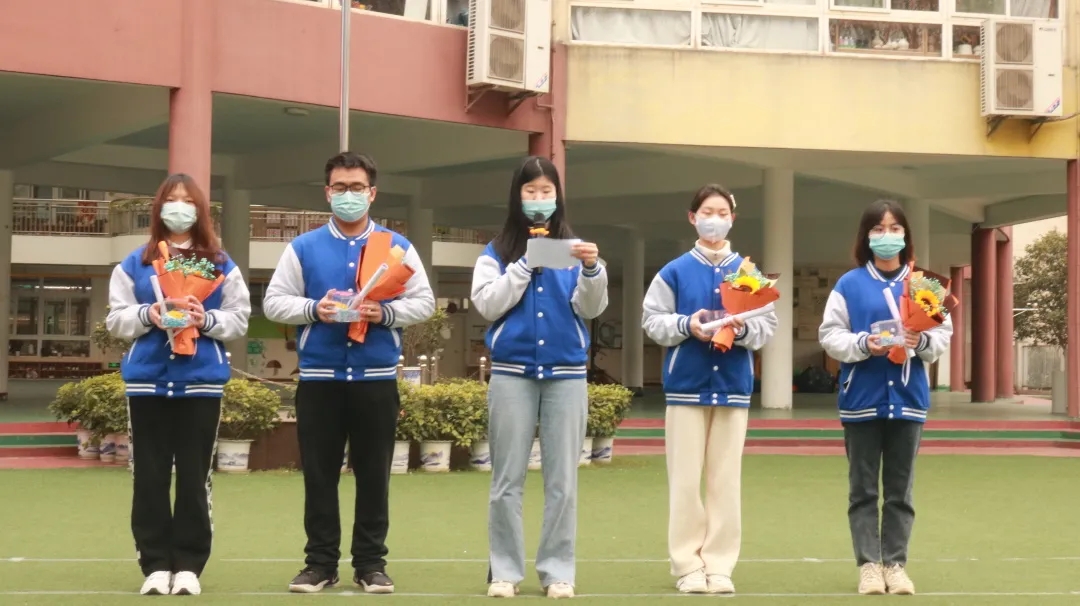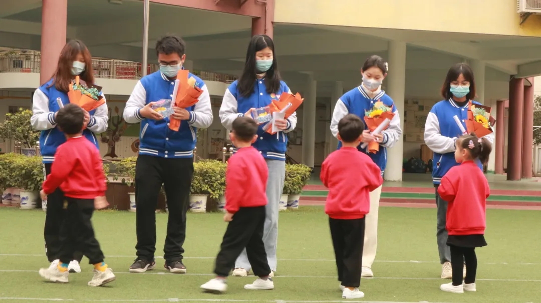 升旗仪式结束后,颁奖活动正式开始。5名优秀志愿者排成一排在主持人的介绍下入场。主持人向青年志愿者对志愿活动的大力支持与无私奉献表示感谢。随后,华师附幼的小朋友代表为优秀志愿者颁发荣誉证书,并赠送花束与小礼物。这不仅仅是表彰的赠与,更是爱心的传递与志愿精神的传承。过去一年中,共计560名青年志愿者在华师附幼护岗志愿服务活动中贡献着自己的力量:护送小朋友上下楼,维持家长接送秩序,确保小朋友个人安全,累计志愿时长达420小时,他们用爱与奉献守护着祖国的幼苗。