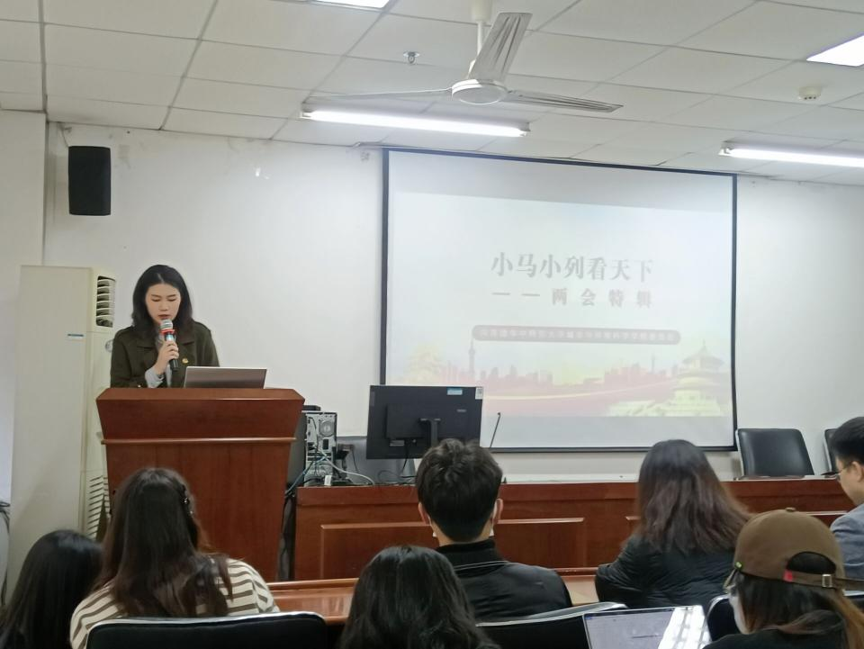 在时事导学环节,城市与环境科学学院团委副书记(学生)王佳淼以学院特色思政宣讲品牌“小马小列看天下”为切入点,围绕“两会”内容,为大家解读了“两会”热点,带领大家聚焦政府工作报告以及习近平总书记在“两会”期间重要讲话。此外,她详细介绍了本次全国“两会”上的华师声音,引导大家增强时代青年的责任感与使命感。