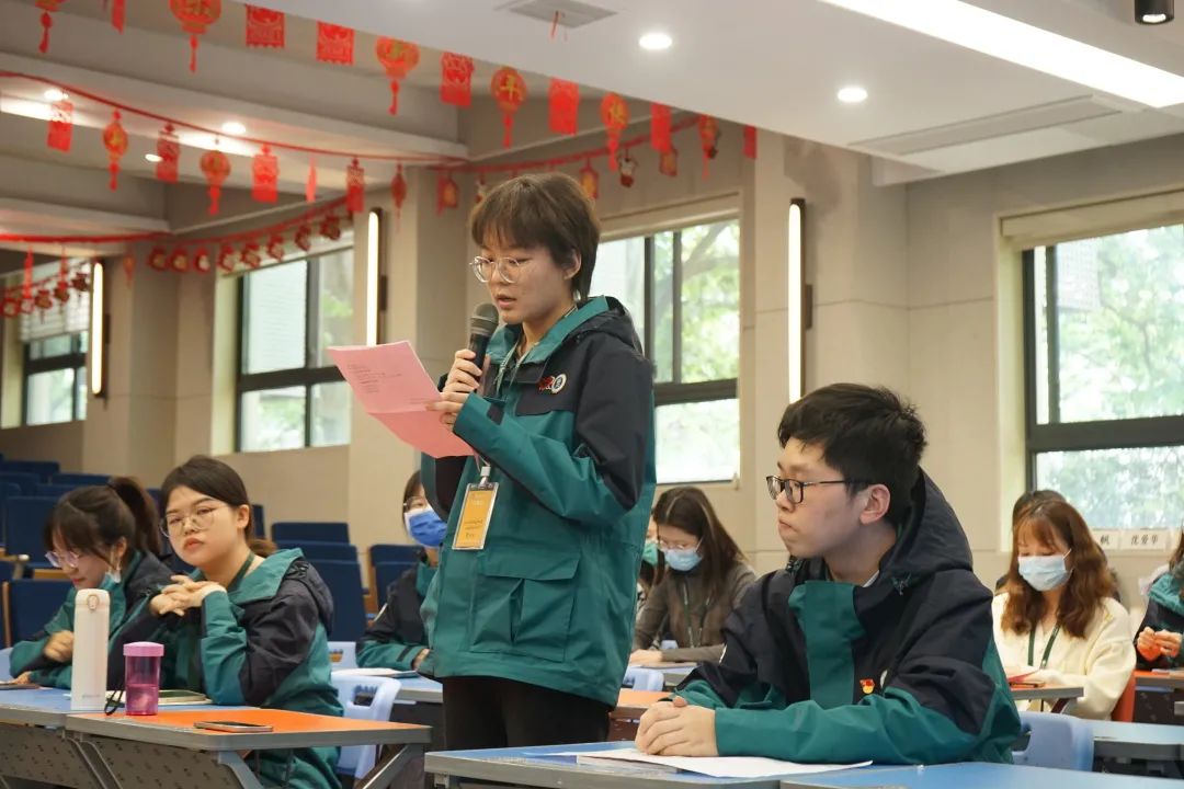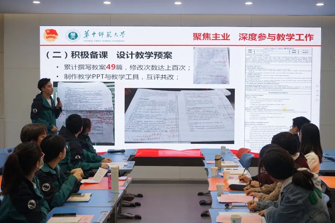 从一个人的成长也可以看出一个团队的进步。会议第二项,李瑞浩作为实习团队组长汇报了研支团教育实习整体工作情况。在为期三周的教育实习中,18名研支团成员累计听课252节,完成听课记录220余篇,在不断的听课学习中汲取了教学经验;同时,还积极备课,累计撰写教案49篇,参与制作教学PPT与教学工具及修改教案上百次。“纸上得来终觉浅,绝知此事要躬行。”研支团成员累计上课84节,内容涵盖新授课、复习课、练习课、主题队课等,覆盖五六年级全部班级与四年级部分班级。并在教学后积极反思,撰写课堂小结、批改学生作业与单元试卷,归纳易错内容与教学侧重点,反复查漏补缺。