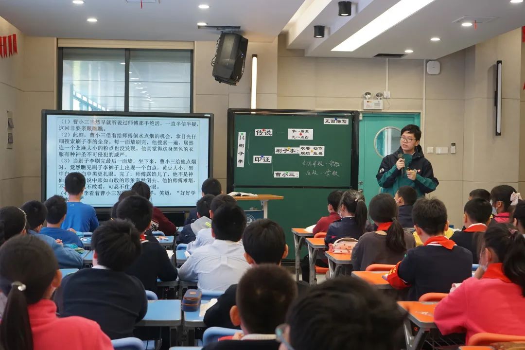 教学为本,能力为先。在为期三周有余的实习时间内,研支团成员们在指导老师的带领下通过听课、备课、上课、评课、批改作业等途径对教育理论和教学实践有了更加深刻的认识,同时,也极大地提升了各自的教学水平。研支团成员叶政通作为语文组实习教师的优秀代表与五(4)班的孩子们共同展示了一节高段语文优质课。