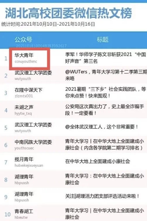 目前,“华大青年”微信公众号粉丝量突破8万,各类融媒体平台全网粉丝量突破10万,浏览量突破1300万。曾在全国高校团委微信公众号榜单中名列第15、湖北高校团委微信排行榜中名列第2;单篇原创推文(非投票类)阅读量最高达2.3万,在全国高校团委微信公众号热文榜中名列第3、湖北高校团委微信公众号热文榜中名列第1。