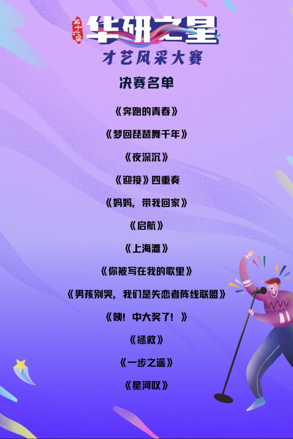 经过选手们的激烈角逐,“华研之星”复赛评委组现场打分,综合评选出13个节目进入决赛。4月15日晚,华研之星决赛将于华师音乐厅举行,选手们将以最好的状态持续散发青春光芒,尽情展示华研风采,用美妙的舞蹈迎接崭新的希望,用动听的音符谱写青春的华章。