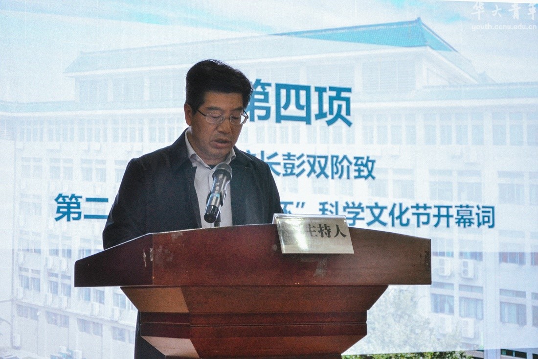 副校长彭双阶为第二十九届“创新杯”科学文化节致开幕词,充分肯定了我校“创新杯”科学文化节在引领校园文化,弘扬科学精神,鼓励学生积极参加学术研究和科技创新活动,全面提高学生综合素质等方面取得的显著成绩,从打造活动“新”形式、营造科创“新”氛围、培育一流“新”人才三个方面,对本次科学文化节的举办提出了明确要求,勉励同学们牢固树立学习意识、创新意识和成才意识,做有志气、有骨气、有底气的新时代青年,为实现华师“双甲子”梦想、推进社会科技创新事业发展书写青春篇章。