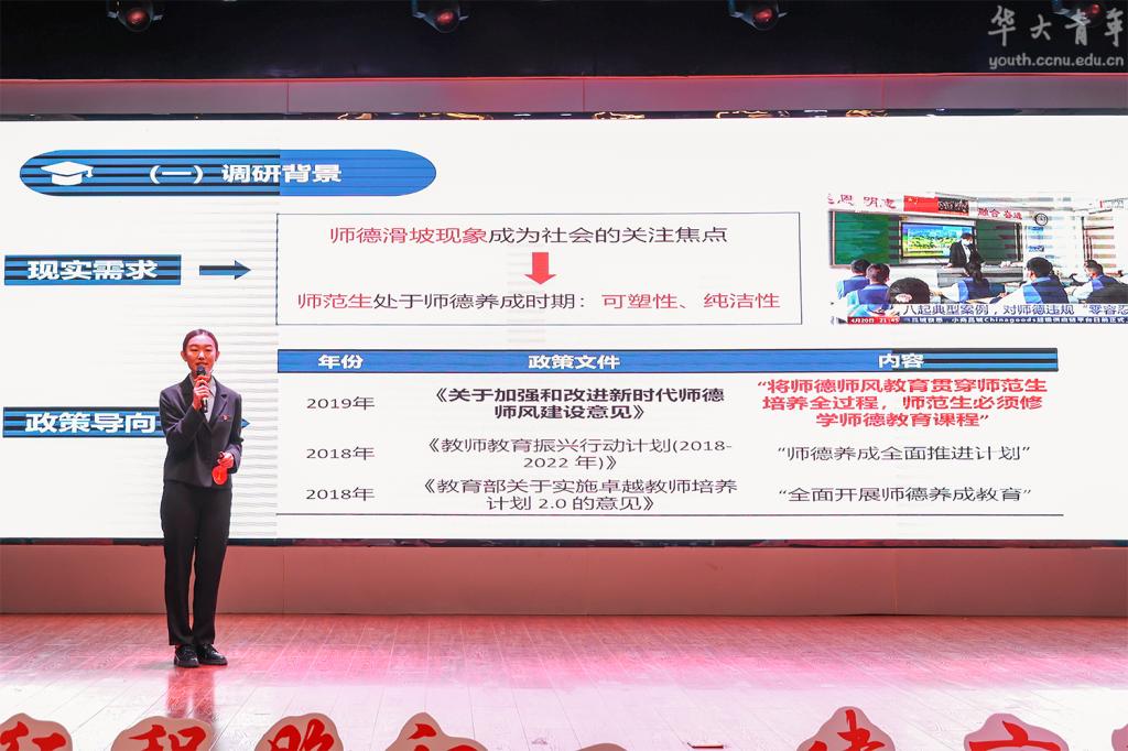 本次活动旨在庆祝中国共产党成立100周年,落实立德树人根本任务,鼓励和引导青年学子把学党史与“我为师生办实事”实践活动相结合,深入社会、了解校情,学会运用科学的调研方法开展实证研究,为学校在新的历史背景下进一步促进办学事业发展献言建策。比赛共设置“教育教学类”、“校园文化类”、“管理服务类”、“四史教育类”、“团队自选类”五类调研主题,吸引85支本科生代表队、6支研究生代表队参加。经过评委层层筛选,来自教育学院、法学院、文学院、经济与工商管理学院、马克思主义学院、社会学院、生命科学学院、心理学院的九支队伍跻身决赛,角逐一、二等奖。决赛包括“展示”、“问政”、“点评”三个环节,九支队伍分A、B、C三组展开比拼。
