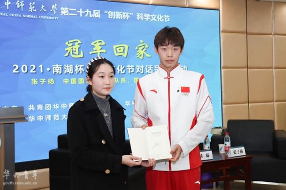 华大青年讯(文字 王一好 吴佩轩 摄影 鲁璟毅 孙宁 吕柯言)11月12日下午,华中师范大学第二十九届“创新杯”科学文化节“冠军回家”暨2021年“南湖杯”体育文化节“对话冠军”活动在南湖综合楼N9115报告厅举行。活动邀请体育学院2020级体育教育专业本科生、国家游泳队运动员、国际级运动健将张子扬作为嘉宾,分享训练心得、交流成功经验。