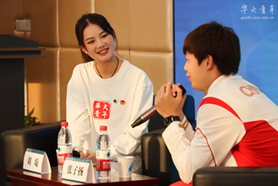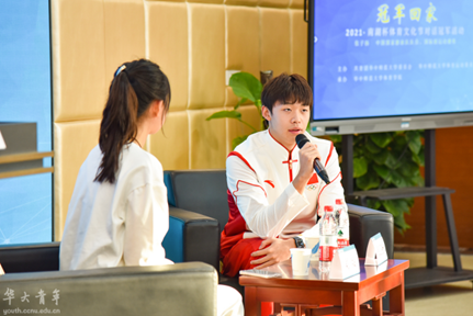 现场提问环节结束后,张子扬表示,自己也想向大家学习,并借此机会向大家提问。他从华大桂声记者马梦梦处了解到,新闻传播行业同样关注着体育赛事,新闻人以笔代戈,用文字记录着体育健儿们的拼搏与努力。张子扬随即表示,很期待华师新闻人能够继续保持对体育的关注和热爱,用文字传播体育精神。
