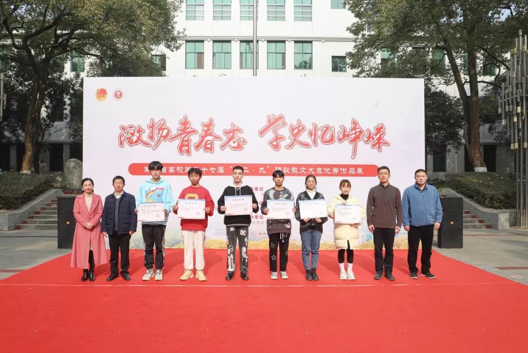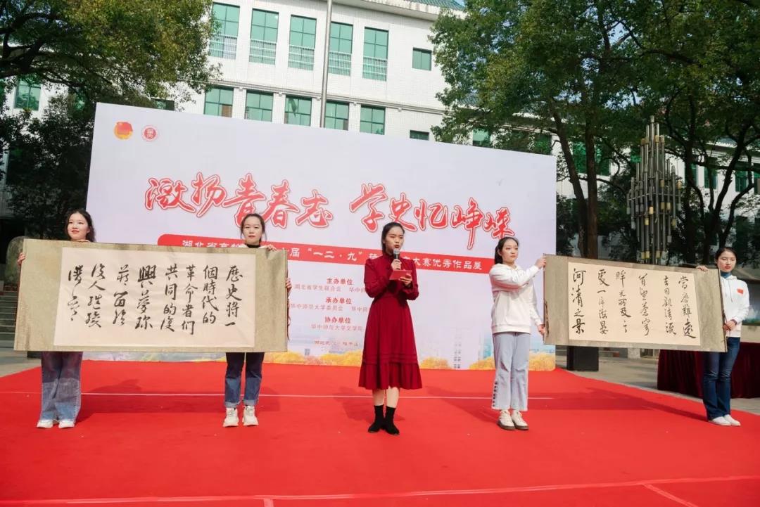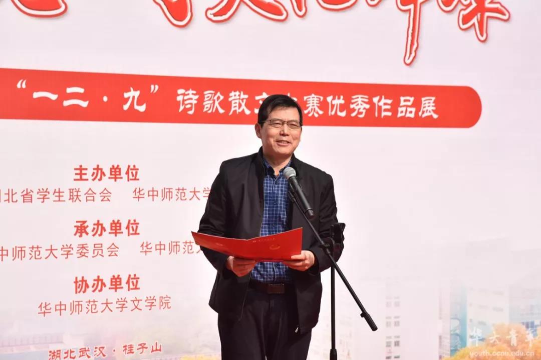 华大青年讯(记者 文学院 摄影 陈希昌 尹昭扬 李钰妧 张欣欣)12月9日中午,湖北省高校第三十七届“一二·九”诗歌散文大赛优秀作品展暨颁奖典礼在我校喷泉广场举行。本次活动由湖北省学生联合会、华中师范大学主办,共青团华中师范大学委员会、华中师范大学学生会承办,华中师范大学文学院协办。湖北省学生联合会驻会执行主席毕晨,校党委副书记陈迪明,共青团湖北省委学校部副部长胡志勇,校关心下一代工作委员会常务副主任谭根稳,湖北省中华诗词学会会长、我校政治与国际关系学院党委书记段维,文学院党委书记朱庆海,校团委书记麻旎,校党委学生工作部副处长李刁,校党委宣传部副部长叶雷,校团委副书记张静,校团委副书记胡余映,文学院党委副书记秦伟,文学院党委副书记徐福刚,湖北省作家协会会员、文学院副教授卢雄飞出席了本次活动。