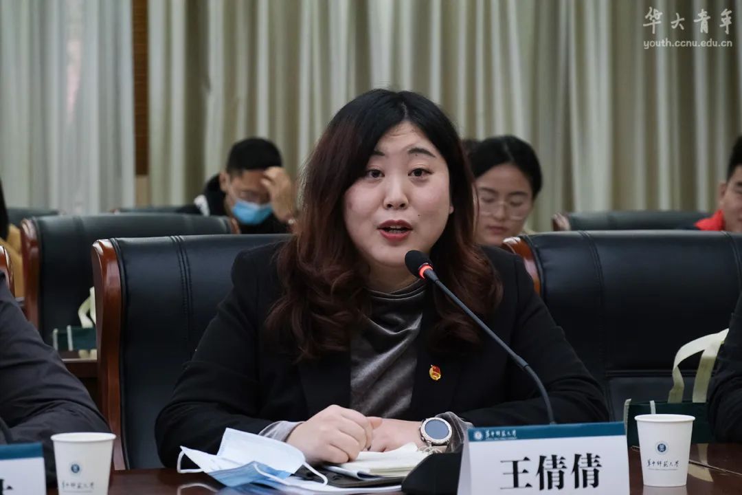 唐佳琦用三个“热”总结了9年来在生命科学学院团学工作的收获和成长——对理想的热忱、对工作的热情、对学生以及教育事业的热爱。胡尉尉也分享了自己在人工智能教育学部担任团委书记时的满满“三感”——在共青团的工作中的满足感、收获感与幸福感。谢定一分享说,“在数学与统计学学院担任团委书记是一个有忙碌但有收获的岗位,大家在团学工作中一定可以找到让自己满意的答案”。恽力达感谢华师共青团的培养,“从学生时期担任社联主席,到正式工作后成为法学院团委书记,没有华师共青团,就没有今天的我”。佐一男表示,无论是在公共管理学院团委书记一职中,还是在未来的工作中,都会继续做好本职工作,秉持青年干部的责任和担当,一如既往地支持学校的共青团事业。王倩倩向与会人员分享了在教育学院的共青团工作经验,她指出,“党旗所指就是团旗所向”,青年团干要坚定跟党走,要抓好基层团委工作,不断加强理论学习。