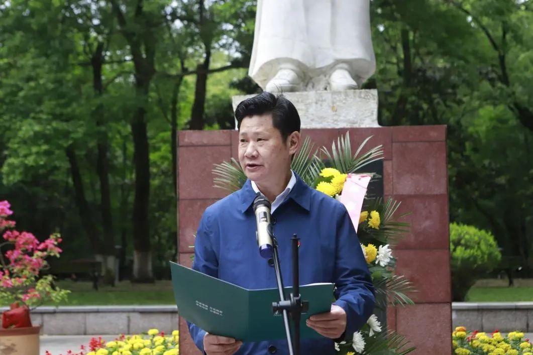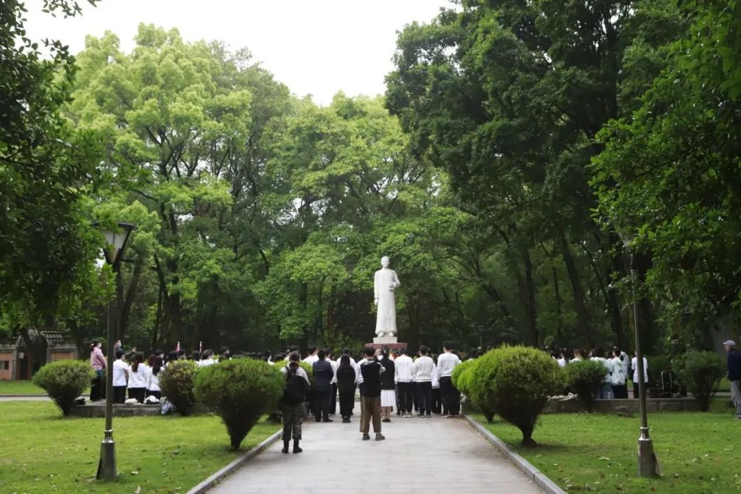 在庄严的《献花曲》中,国旗护卫队迈着整齐而缓慢的步伐走来,为恽代英烈士敬献花篮。赵凌云庄重上前,认真整理花篮缎带,带领在场师生缓步绕行恽代英广场,瞻仰恽代英烈士雕像,并敬献鲜花。