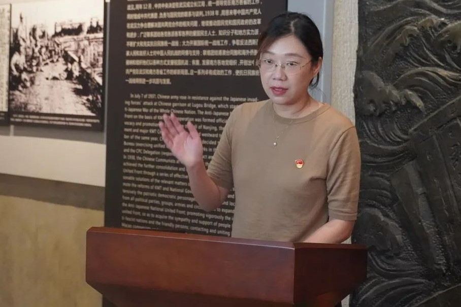 随后,麻旎与张帆共同为“华中师范大学青年志愿者教育实践基地”揭牌,正式宣告华中师范大学青年志愿者教育实践基地的建立。揭牌仪式后,参会人员跟随华中师范大学讲解志愿者和纪念馆讲解人员参观展览,从抗日民族统一战线的巩固与发展到抗日战争的全面胜利,参观人员在全面感受抗日战争的艰辛与中国共产党的智慧中,进一步接受红色文化的熏陶,感受红色血液的脉动。