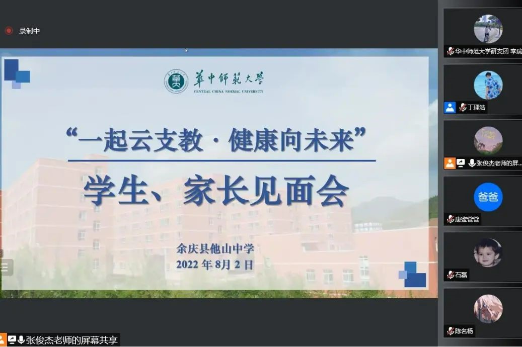 8月2日晚,“一起云支教·健康向未来”他山中学学生、家长见面会在线上举行,会议由华中师范大学体育学院团委书记张俊杰主持。共青团余庆县委副书记谭达、华中师范大学团委副书记胡余映、华中师范大学体育学院党委副书记高尚、华中师范大学团委社会实践部部长胡羽、他山中学副校长李龙琼出席会议并讲话。华中师范大学研究生支教团余庆分队成员、“筑梦体育人”实践队成员和报名此次活动的学生及家长参加见面会。