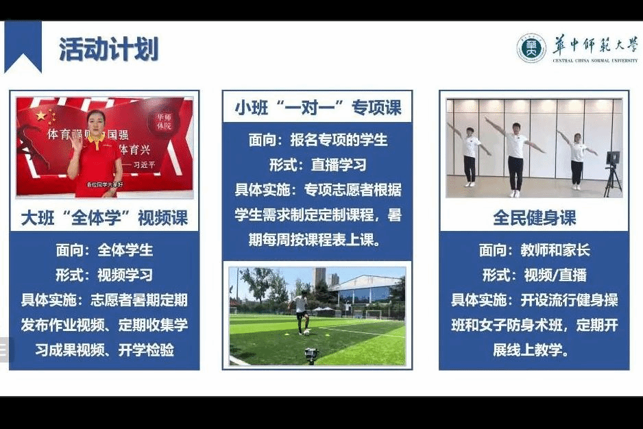 “一起云支教,健康向未来”活动通过视频教学、直播展示、线上线下互动等方式,面向贵州省中小学生开展科学健身示范推广行动。活动主要课程包括大班“全体学”视频课、小班“一对一”教学课和全民“大众式”健身课,内容专业、形式丰富、参与广泛,充分发挥华师体育人优势,整合优质教育资源,切实提升学生健康素养,为孩子们营造健康科学、阳光向上的多彩假期。