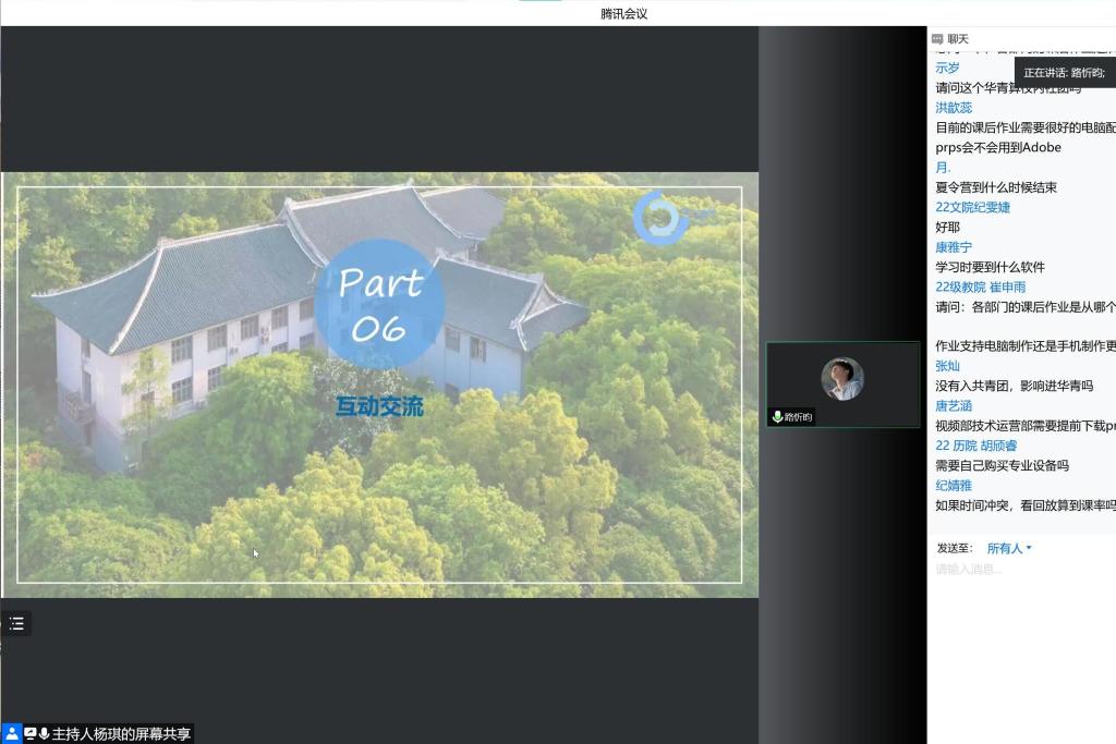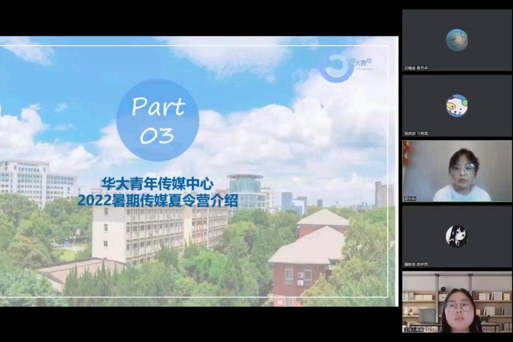 总编室路忻昀对夏令营活动安排展开具体讲解。本次夏令营分为情怀分享、技能培训、实操演练三大板块,从华师共青团组织介绍,到常用办公软件使用方法,再到版面设计、短视频制作、摄影视频处理,课程设计逐步深入。她表示,相信在多名优秀专家、学生的鼎力支持下,此次华大青年传媒中心2022暑期传媒夏令营定能为全体营员带来一场精彩的传媒盛宴。