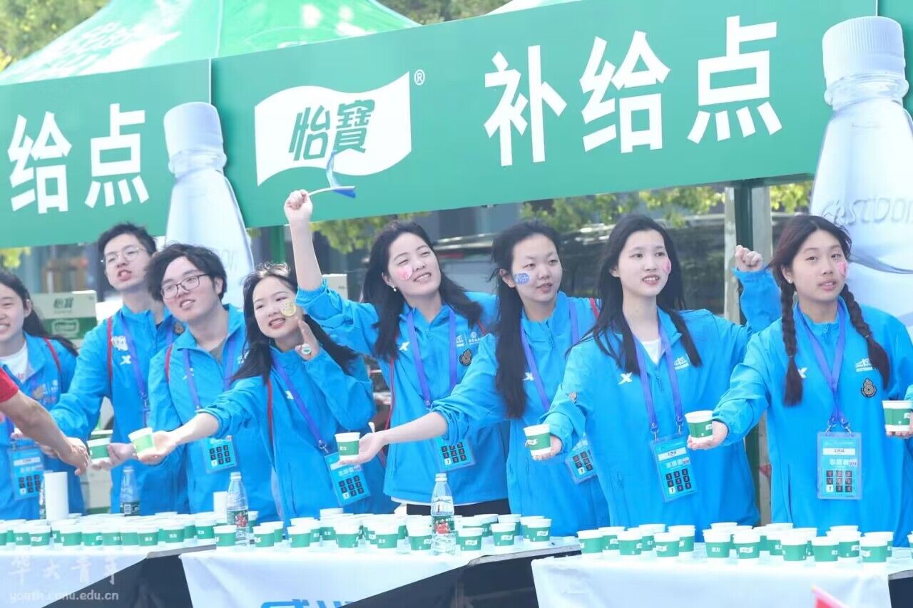 随着大批参赛选手抵达站点,志愿者更加忙碌起来。他们面带微笑,积极为选手们加油鼓劲,给选手们提供补充能量的饮料或饮用水。许多选手被华师志愿者的热情感染,主动和志愿者击掌点赞。迎风飘扬的华师校旗、汉马活动标语牌、志愿者微笑的面庞、递送物资的手臂,组成了跑道一侧最靓丽的蓝色青春风景线。