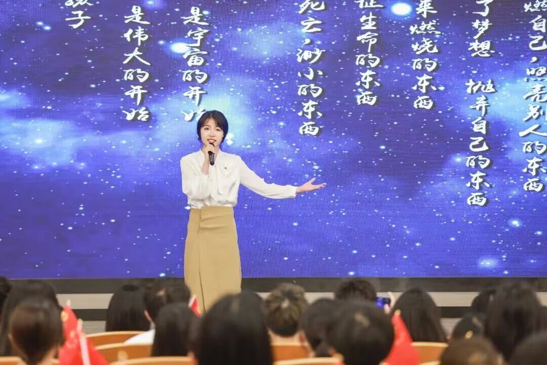 团课创新授课形式,采用青年学生喜闻乐见的表达方式,将习近平新时代中国特色社会主义思想更好地讲进学生心里。现场奏响《没有共产党就没有新中国》《建党百年版错位时空》《如愿》等歌曲,引发全场师生大合唱,发出属于当代青年的青春之声。新闻传播学院2021级本科生李玥蓉朗诵了一位奋战在航天事业一线的母亲写给女儿的《诗》,致敬全体自力更生、前赴后继、不惧牺牲的中国航天人。