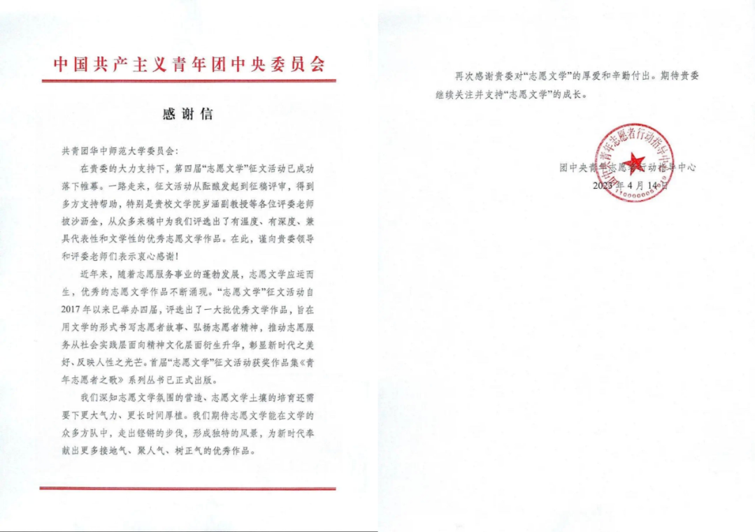 华大青年讯(文字 谭诗芹 何欣宇 李心仪 唐永迪 吕佳璇)最美人间四月天,大爱华师正当时。四月,学校4604名青年志愿者,在各级团组织的指导下,依托青年志愿服务组织,累计开展238项系列活动,累计志愿服务时长达24148小时。团中央青年志愿者行动指导中心发来感谢信,信中感谢了学校团委与岁涵副教授等评委老师对第四届“志愿文学”征文活动的帮助。各青年志愿服务组织在校院两级团委的指导下,积极开展各类志愿服务活动,生动展现了新时代华师青年的志愿“锋”采。