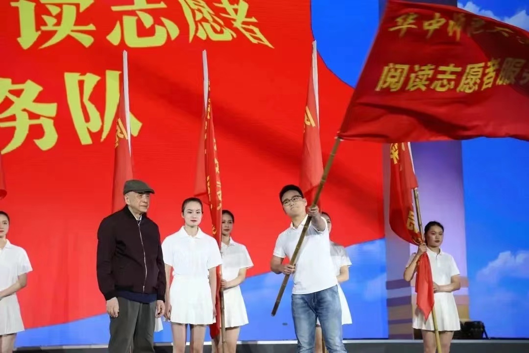 2018年4月23日,湖北省“书香荆楚·文化湖北”全民读书月启动仪式上,章开沅先生为大学生阅读志愿者服务队授旗。章先生一直以来对青年都有着很多期望寄许,他关注青年的动态和青年的品质,表示这是青年发挥力量的最好的时代,也一直在用行动支持和勉励青年学子,终身学习,追求上进。