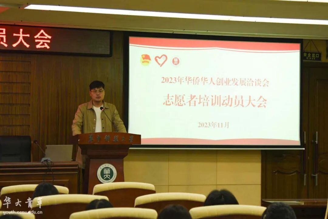 华大青年讯 (文字 薛雨欣 余汗青 朱怡凝 摄影 刘腾飞)为进一步推进2023年华侨华人创业发展洽谈会志愿服务工作,向海外华侨华人展现青年风采。11月10日下午,2023年华侨华人创业发展洽谈会志愿者培训动员大会在学校逸夫国际会议中心一楼会议室召开。湖北省委统战部知工处副处长彭涛,华中师范大学党委统战部干部罗剑,校团委(学生)副书记、青志联指导老师胡一心受邀出席大会,2023年华创会全体志愿者参加培训。此次志愿者团队中包含17名研究生支教团成员,以及31名来自校学生会、校研究生会、华大青年传媒中心、青年志愿者联合会等学生组织的学生骨干。本次大会由校团委志愿服务部部长卢俊霖主持。