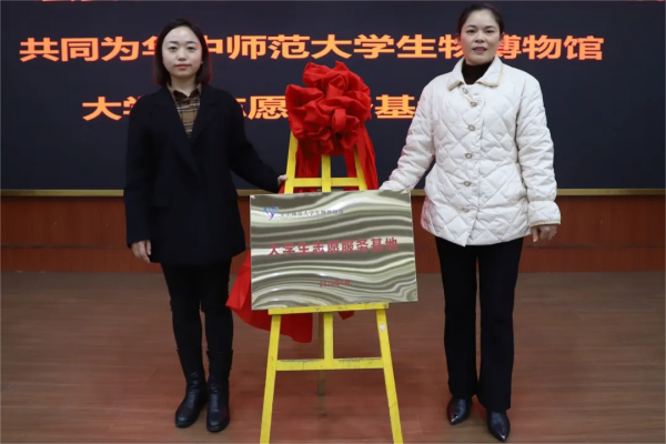 随后,袁珍珍和唐梅共同为华中师范大学生物博物馆大学生志愿服务基地揭牌。