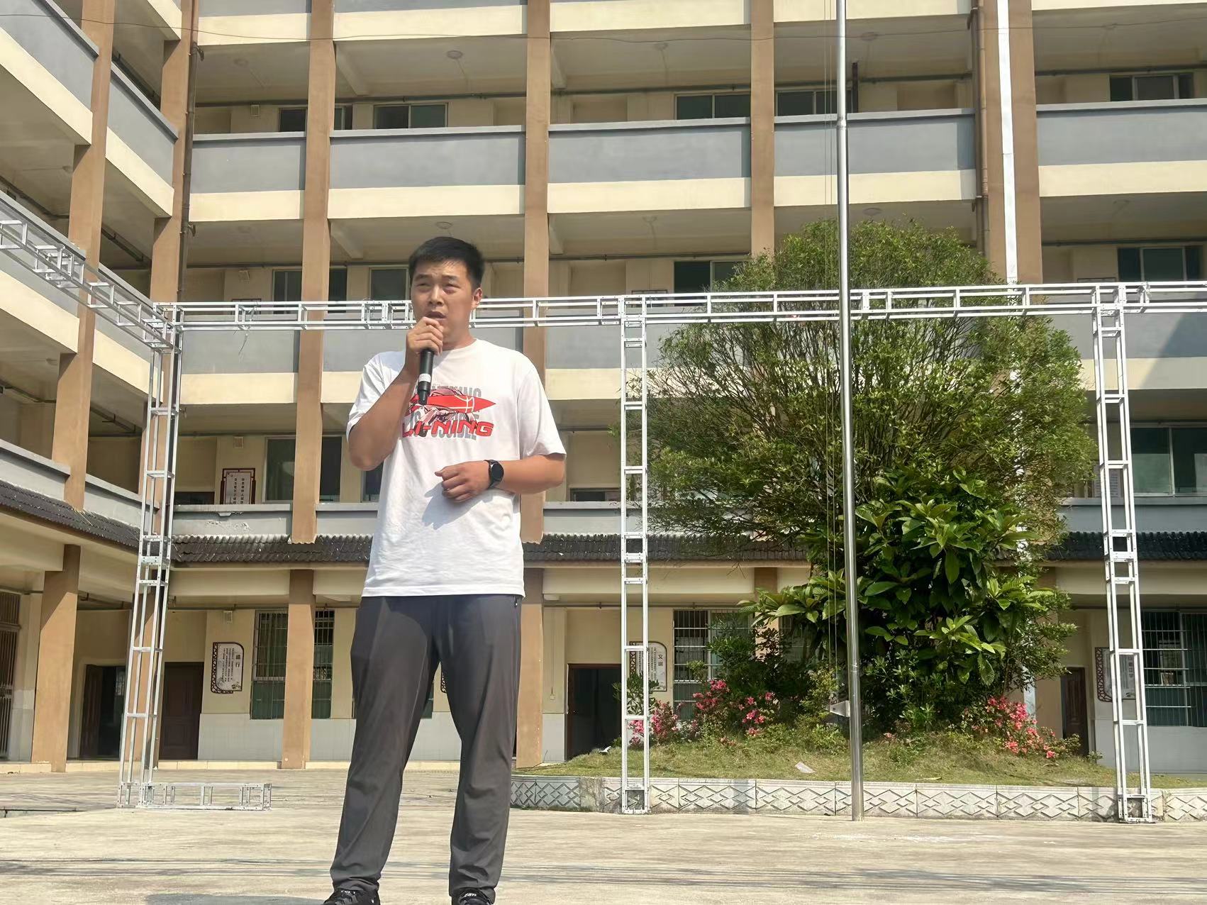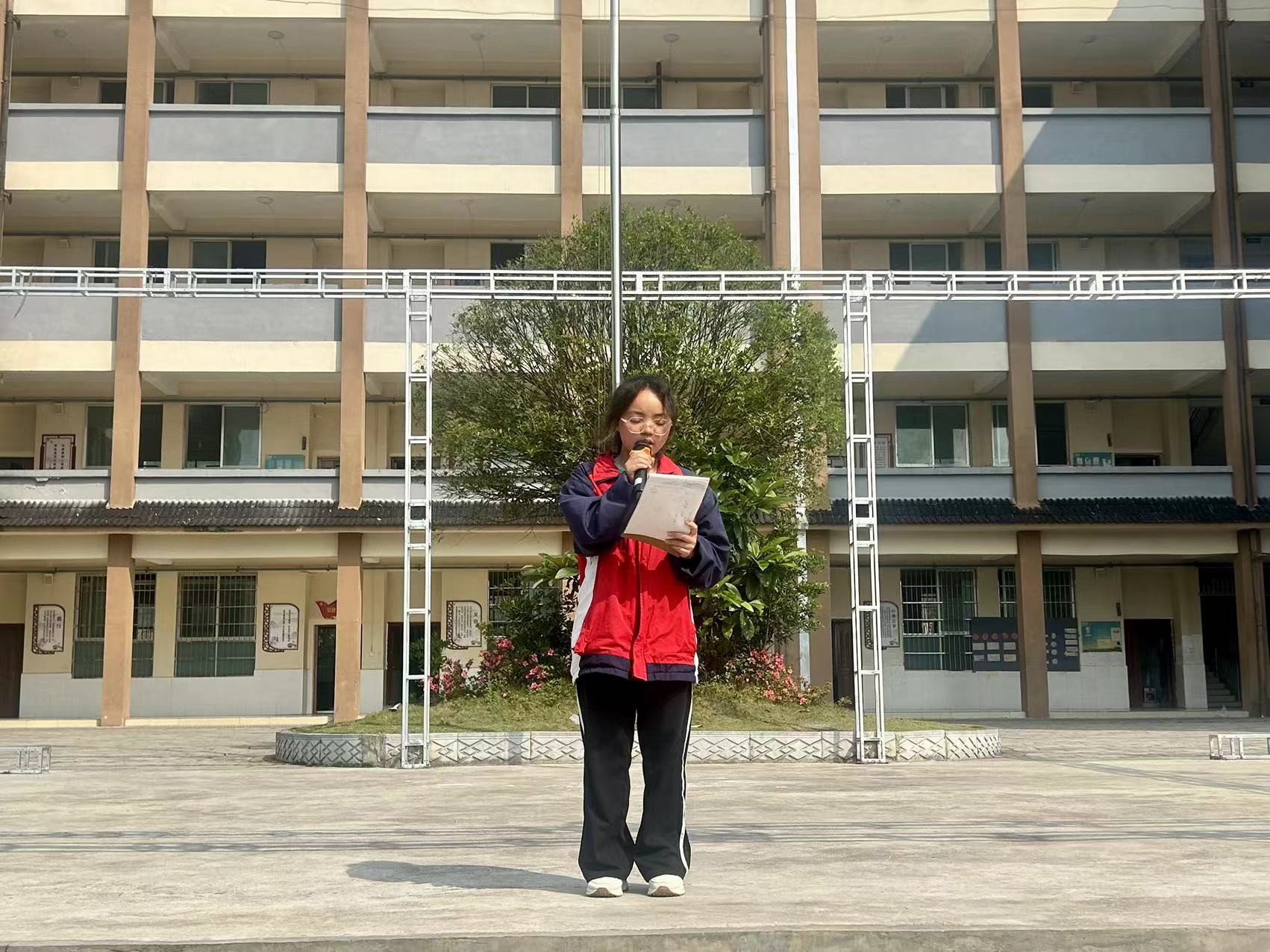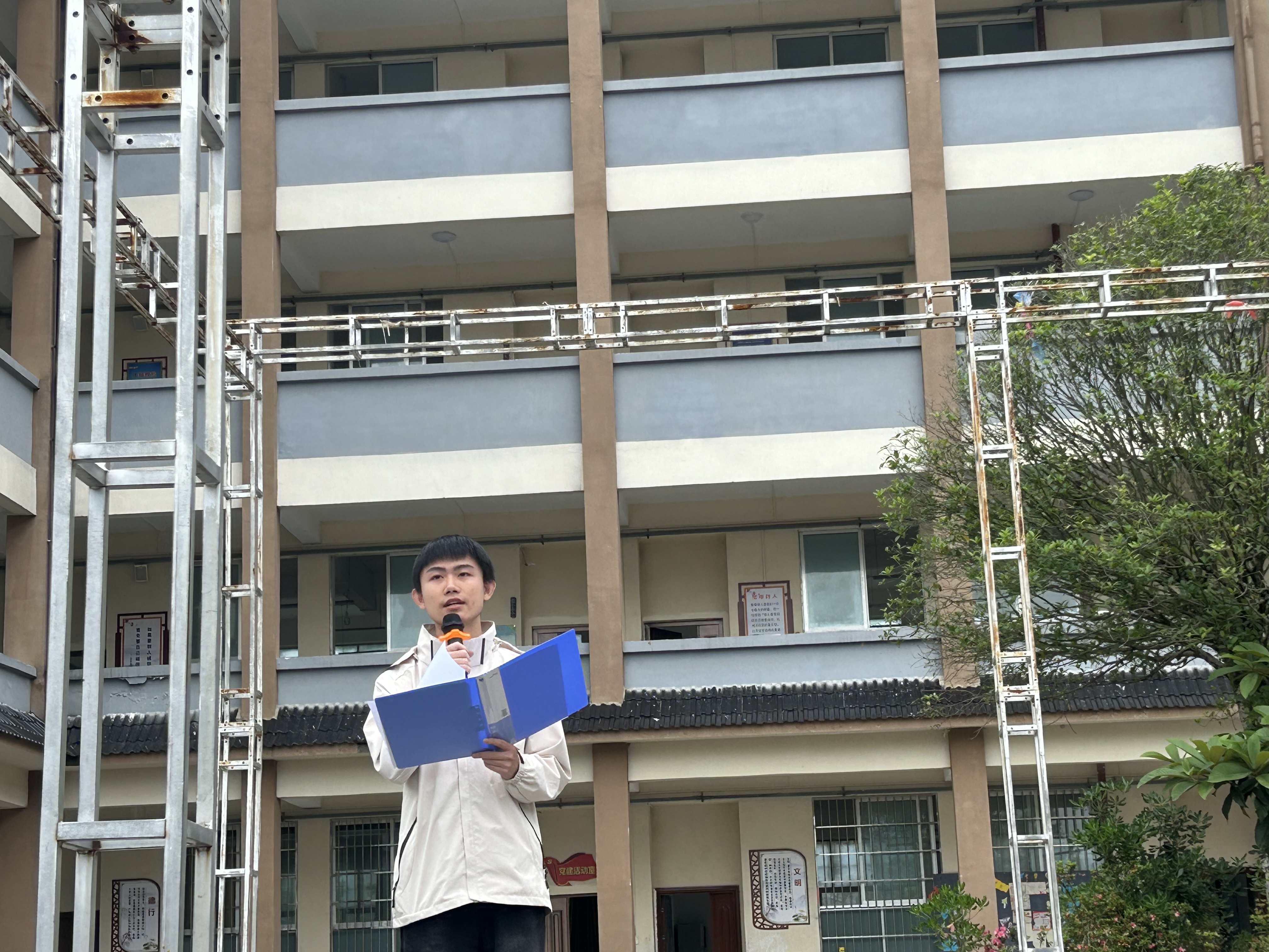 2024年4月28日的升旗仪式上,学生代表廖玉表达了对华中师范大学研究生支教团老师以及社会爱心人士的感谢,立志要努力学习,将来回报社会。