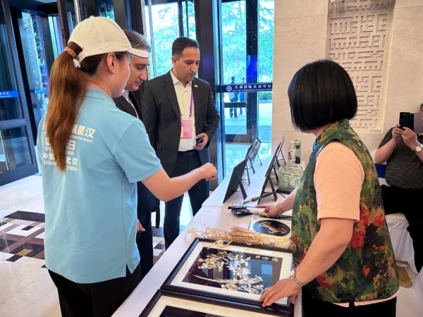 与本次“航天日”主场活动和中拉论坛同时开展的还有非遗展,论坛茶歇期间,新洲竹雕、湖北青砖茶、麦秆画等湖北非遗文化展位吸引了众多外宾的目光。志愿者积极为参观展位的外宾们进行翻译介绍,激发了他们对湖北非遗文化的浓厚兴趣。