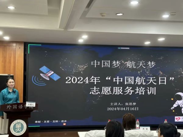 为全面做好本次活动的志愿服务工作,4月16日中午,志愿者培训动员大会华师分会场在外国语学院召开。武汉市青年志愿者协会副秘书长吴婷、武汉团市委统战联络部干部夏杨文出席,外国语学院党委副书记罗舰出席并作动员讲话,外国语学院团委书记吴波主持培训会,国际注册高级培训师、国家广电总局A级播音员主持人张思梦为志愿者开展“中国航天日”志愿者服务培训。