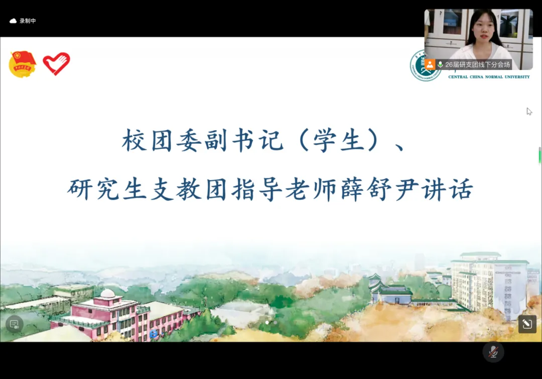 华大青年讯(文字 唐艺卓 高庭仪 摄影 王逸涵 赵恒健 李鑫)为深入学习宣传贯彻习近平总书记五四青年节对全国广大青年寄语精神,引导研究生支教团成员坚定初心使命,奋力书写为中国式现代化挺膺担当的青春篇章,5月10日,华中师范大学第25届、第26届研究生支教团成员线上、线下联动开展学习习近平总书记五四青年节对全国广大青年寄语精神专题学习会暨5月党日活动。校团委副书记(学生)、研究生支教团指导老师薛舒尹,华中师范大学第25届、第26届研究生支教团全体成员参加活动。活动由第25届研究生支教团团长周旺章主持。