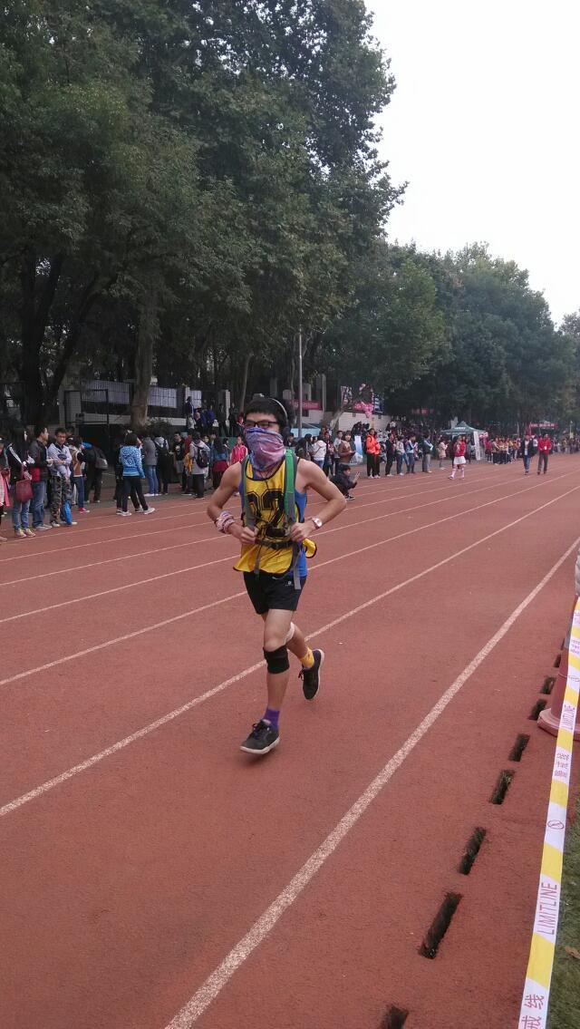 常有人对着他的双肩包指指点点,甚至怀疑他是不是为了能在最后几圈卸下背包好跑得轻松一些。对于别人的疑惑,他淡然一笑:“我们学院就我一人参加运动会,我刚到场发令枪就响了,没人帮我看包,所以只好背着包跑步了。”当大家开玩笑地问他戴面巾是不是因为武汉的雾霾,他解释道,戴面巾只是为了增加空气的温度来减少肺部的不适。