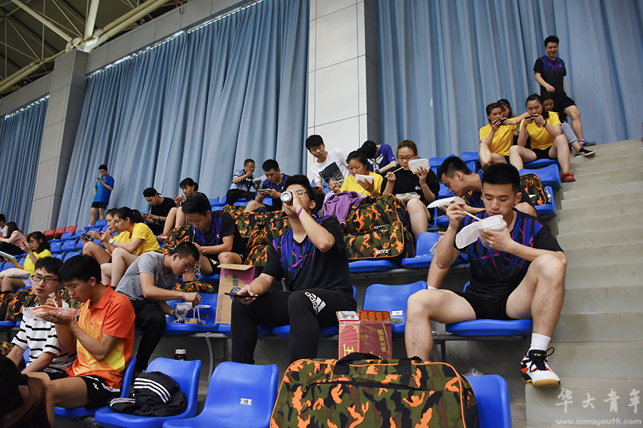 在男团和女团的比赛中,我校羽毛球队和武大羽毛球队数次交手,都引得全场沸腾。双方队员在场下打得不可开交,双方的啦啦队在看台上的碰撞更是火花四溅。据体育学院16级的孙晨雨回忆,在一场男双的比赛中,双方啦啦队“唱山歌似的喊加油”,偌大的体育馆全是华师、武大的队员为自己正在奋力搏杀的队友呐喊助威之声,队员们的嗓子都喊哑了也不停下来。