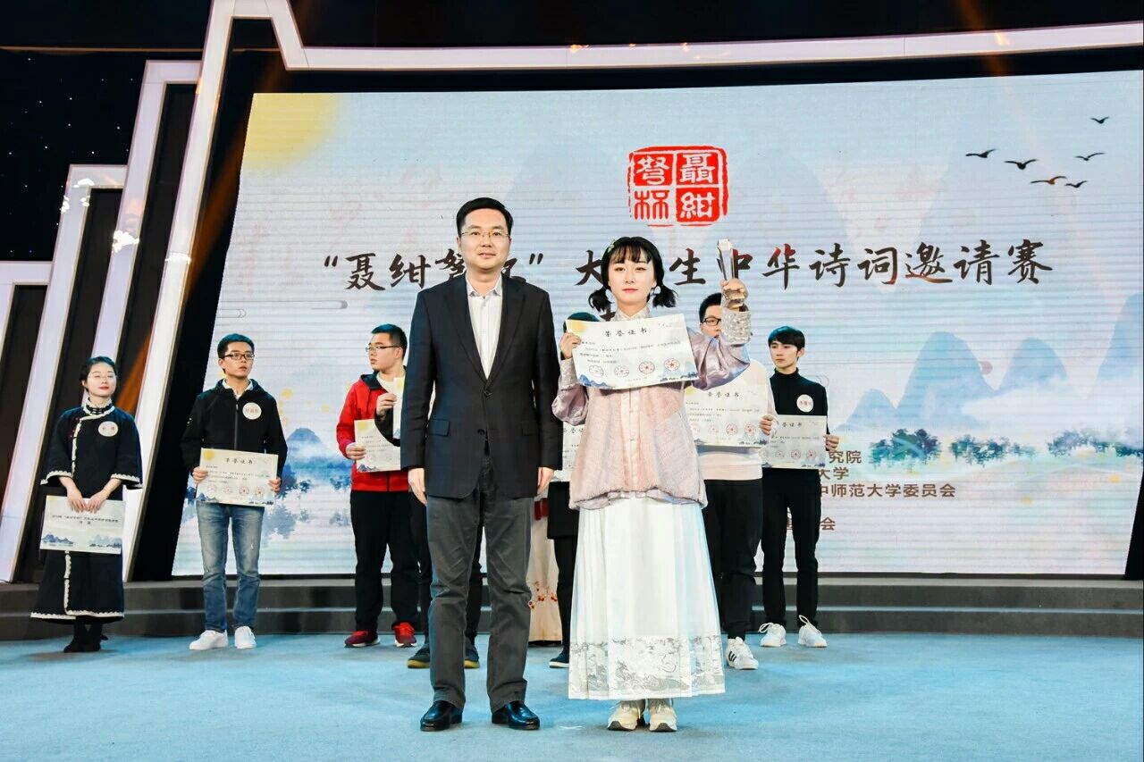 第一次听到“聂绀弩”杯中华诗词邀请赛,李宜洁便暗下决心要为华师夺得荣誉,一首原创作品《观【厉害了,我的国】有感》以其磅礴之气势,雄浑之意境直接将李宜洁送上了开往终点站的列车。你无法想象这样一首浑然天成的《观【厉害了,我的国】有感》出自一名还只是大三的女孩之手。“数尽峥嵘成古今”,道尽了中华儿女多舛的命运与不屈的灵魂;“俯仰九洲轻系命”,更让我们感受到了李宜洁身躯之下那颗博大的家国之心。她哀,哀中华民族曾经历的屈辱的血泪史,人民流离失所,渺小无助;她叹,叹那群在和平时代为了人民的福祉上下求索,直到皓首白头,将一颗丹心捧给家国的平凡人;她盼,盼自己在不久的将来就要站上三尺讲台,守护她想守护的人,从此世界便是风光霁月!作为一名仍在时代的洪流中激扬青春,浪遏飞舟的青年,李宜洁经常思考人生的意义与价值究竟为何?而正是走在前面的无数可爱又可敬的人,点燃了李宜洁对教育事业的热忱,也让她在某个瞬间明白自己的人生使命就是守护教育,守护她想守护的人。“我很幸运我是一名师范生,以后我会站在讲台上,守护着我想守护的人。”凭借这首一气呵成,气势如虹的原创作品,李宜洁不负众望,冲进了决赛。