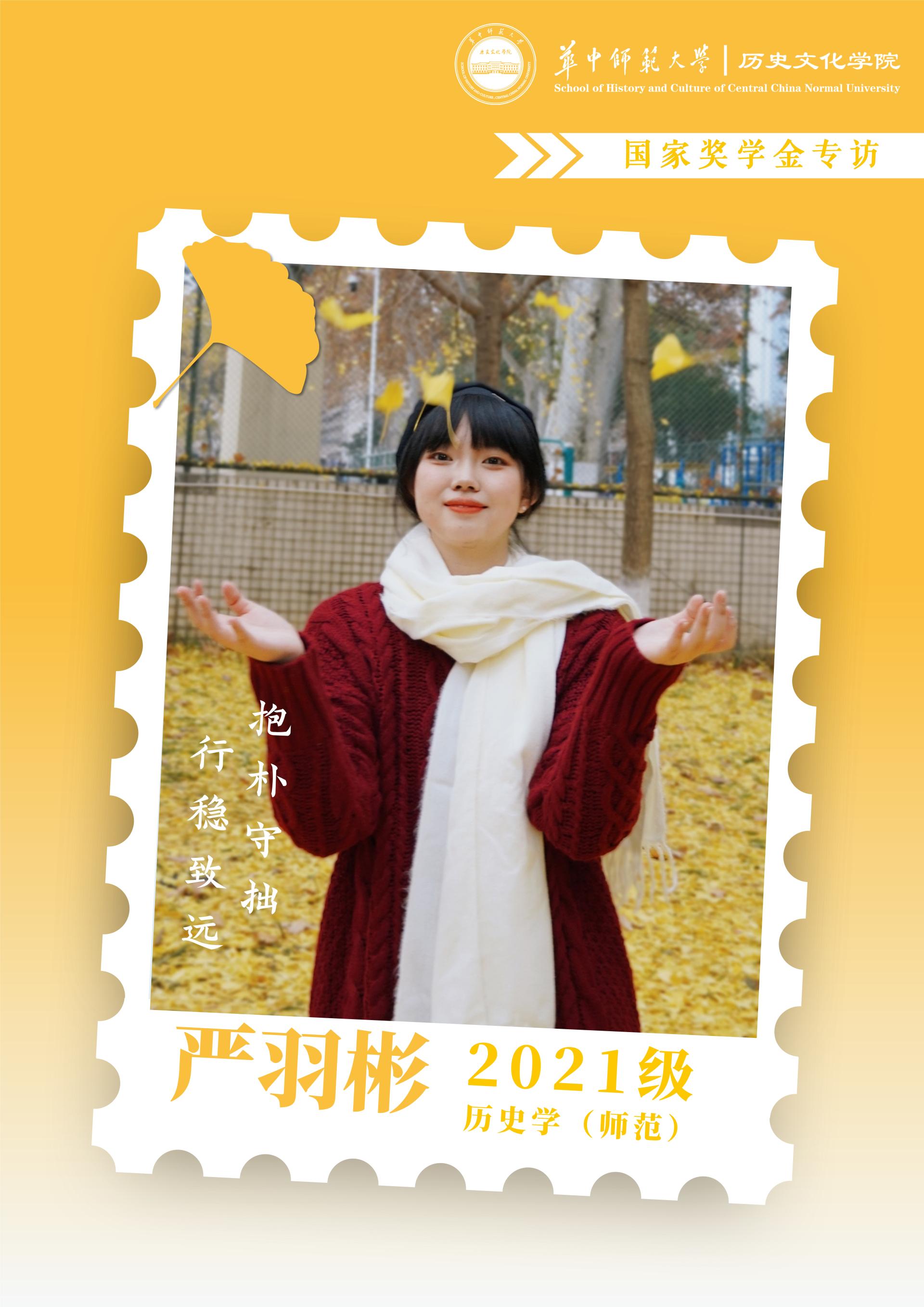 严羽彬,华中师范大学历史文化学院2021级公费师范生,2023-2024学年综测排名专业第一。曾任2102班班长、院新闻宣传中心副主任(学生)等学生工作职务,任职期间多次带领部门获得优秀部门、集体奖学金等荣誉,带领班级获校“先进班级”、校“优秀团支部”、院“优秀师范生集体”一等奖等荣誉。曾获国家奖学金,多项校级奖学金及校“三好学生”、校“网络宣传积极分子”、“校优秀共青团员干部”等荣誉称号。