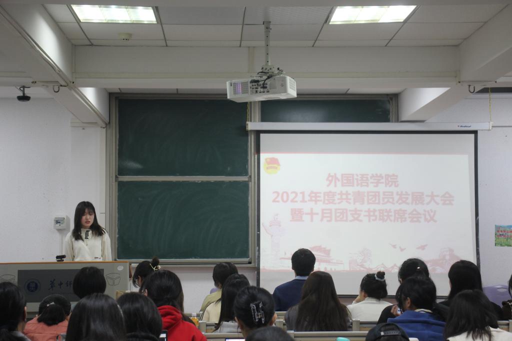 华大青年讯(通讯员 李星睿 于舒雅) 10月29日中午,外国语学院2021年度共青团员发展大会暨十月团支书联席会议在3218教室开展。本次会议旨在以答辩的形式选拔共青团员,进一步加强对团员的培养、教育和考察,同时加强各支部之间的交流,保证支部建设工作的顺利进行。出席本次会议的有外国语学院团委书记张亚鹏,外国语学院各支部团支书以及发展团员。会议主持人由组织部主要负责人黄薪妃担任。