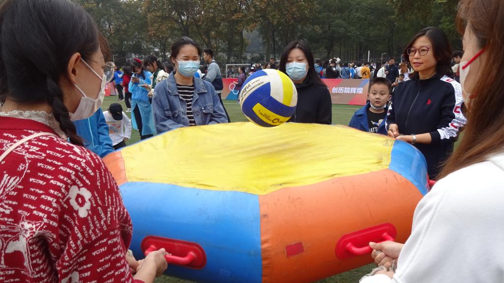 5日下午,教工组趣味团体赛“雷霆战鼓”在佑铭体育场举行。外院教工江琳、谭华等九位教工代表外院参赛。比赛限时两分钟,要求八人以圆圈状排列,每人手持一根绳子将中间的充气鼓拉起,另外一人则跟随队伍负责捡球。参赛选手需配合发力将大鼓上的球弹起,球离开鼓面并顺利落回即算一分。