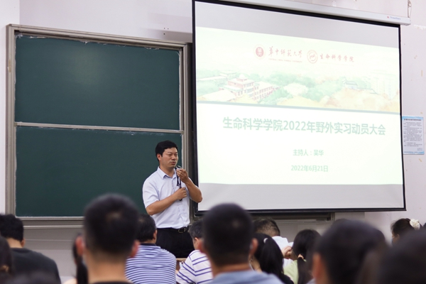 华大青年讯(通讯员 马菁蔚 欧阳文倩 刘飞宇)6月21日晚7点,为顺利开展野外实习活动,激发同学们参与野外实习的热情,生命科学学院于九号楼9201教室举行2022年野外实习动员大会。参与本次动员大会的有:生命科学学院党委书记郑宁,院长邱保胜,副院长吴华,动植物学教师代表,辅导员赵耀、徐晨阳,参与2022年野外实习的共279名同学。本次动员大会由吴华主持。