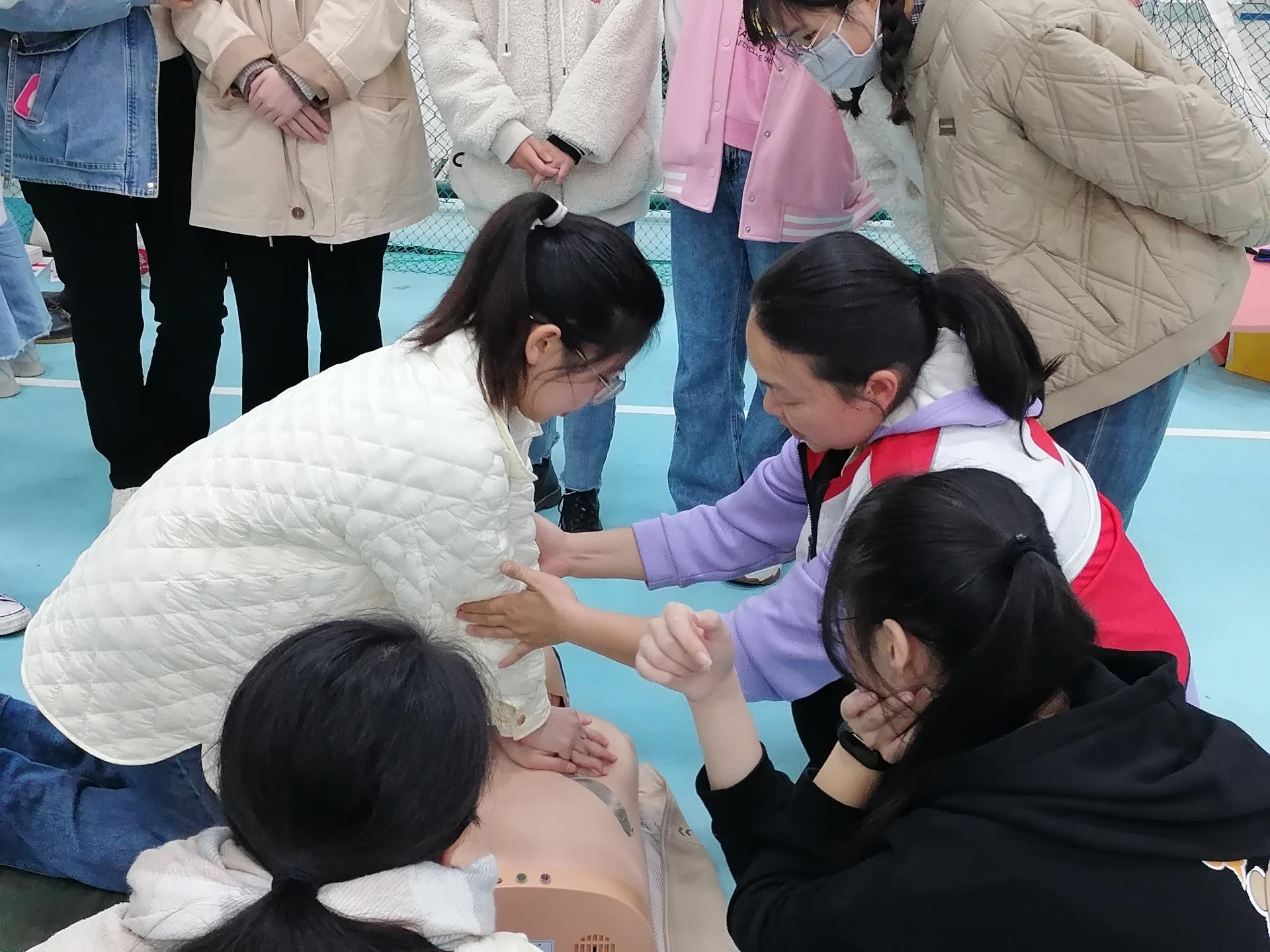 面授培训第一部分,心肺复苏实操练习。学生以十人左右为一组,由来自湖北省红十字会的培训老师为他们讲解心肺复苏的操作要点并进行操作示范。心肺复苏主要包括以下步骤:评估现场环境安全、判断意识、检查呼吸、呼救、判断是否有颈动脉搏动、松解衣领及裤带、胸外心脏按压、打开气道、人工呼吸、持续2分钟的高效率的CPR、判断复苏是否有效、整理病人并进一步生命支持。此前,学生们已通过网上培训了解并掌握了心肺复苏、AED、气道异物梗阻等相关理论知识,因此能够较好地掌握心肺复苏操作要领并通过心肺复苏实操考核。