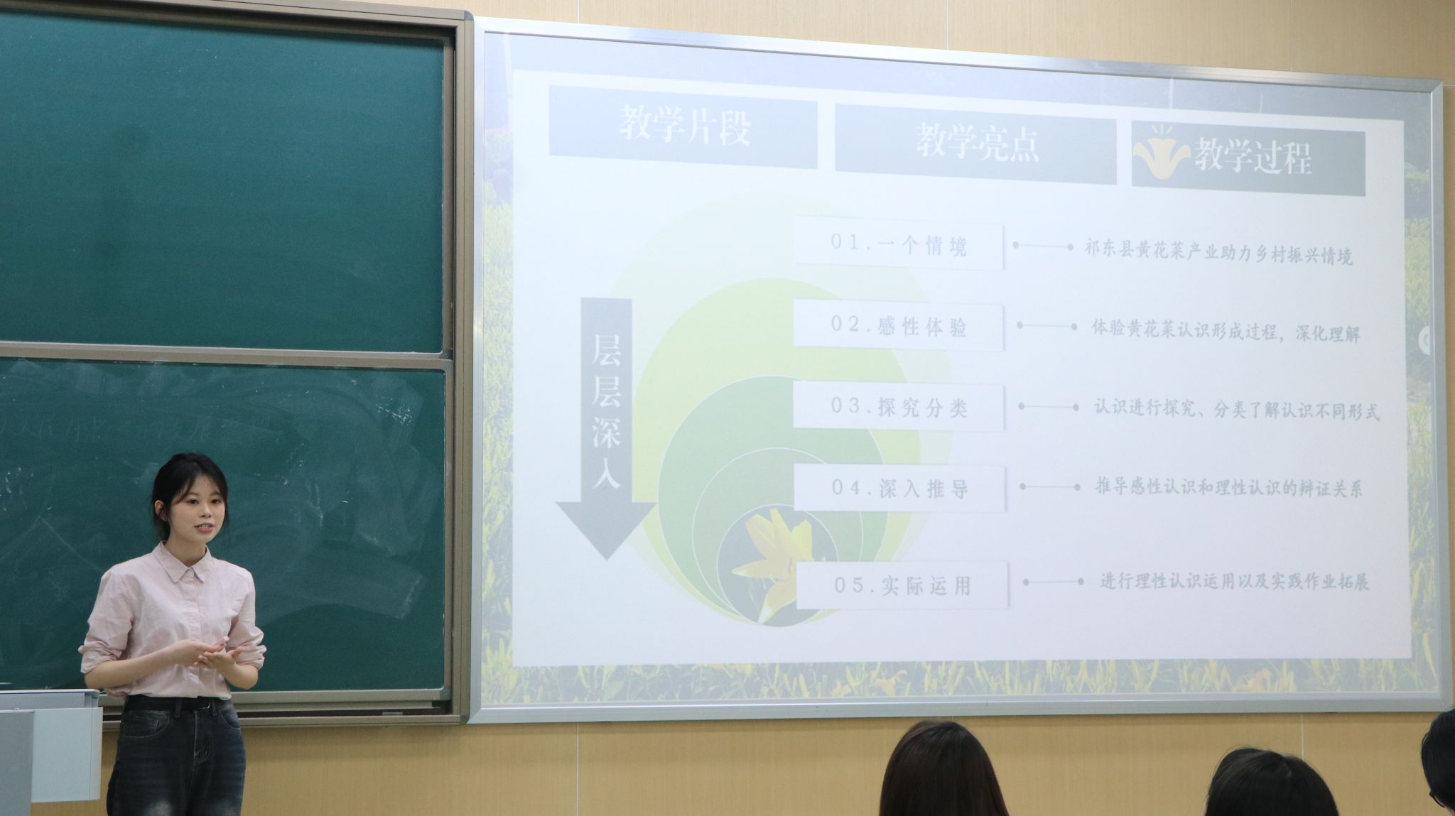 本次比赛分为教学设计思路阐述和模拟授课两大环节。说课环节主要从教材分析、学情分析、教学目标、教学方法、教学过程五个方面展开。授课环节选手主要根据其设计的教学片段进行模拟授课,重点展示提问、讲解、演示等教学技能。
