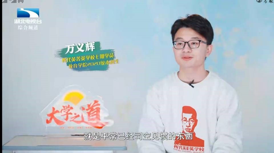 2021年10月至2022年1月,万义辉组织策划、参与拍摄了湖北省社会科学联合会、湖北广播电视台联手打造的首档大学生成长纪实节目《大学之道》,不断深化自身的初心使命,用切实行动打动更多的人。在录制前,万义辉特地加强了政治学习,夯实了理论基础。面对镜头,万义辉用心用情吐露出青年人的心声,将华师青年人的昂扬的精神状态与奋发的前进姿态展现给社会公众。