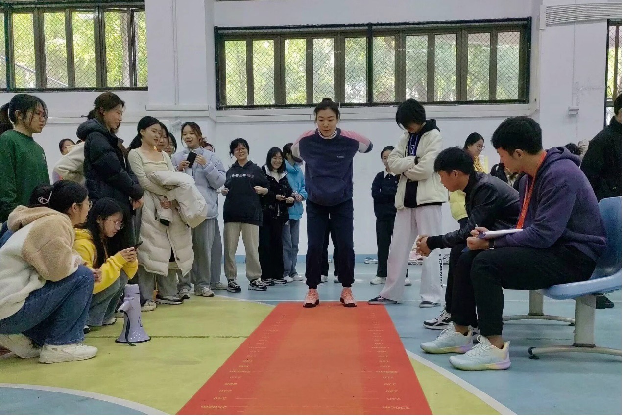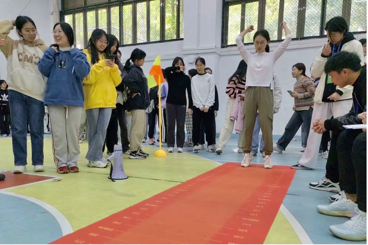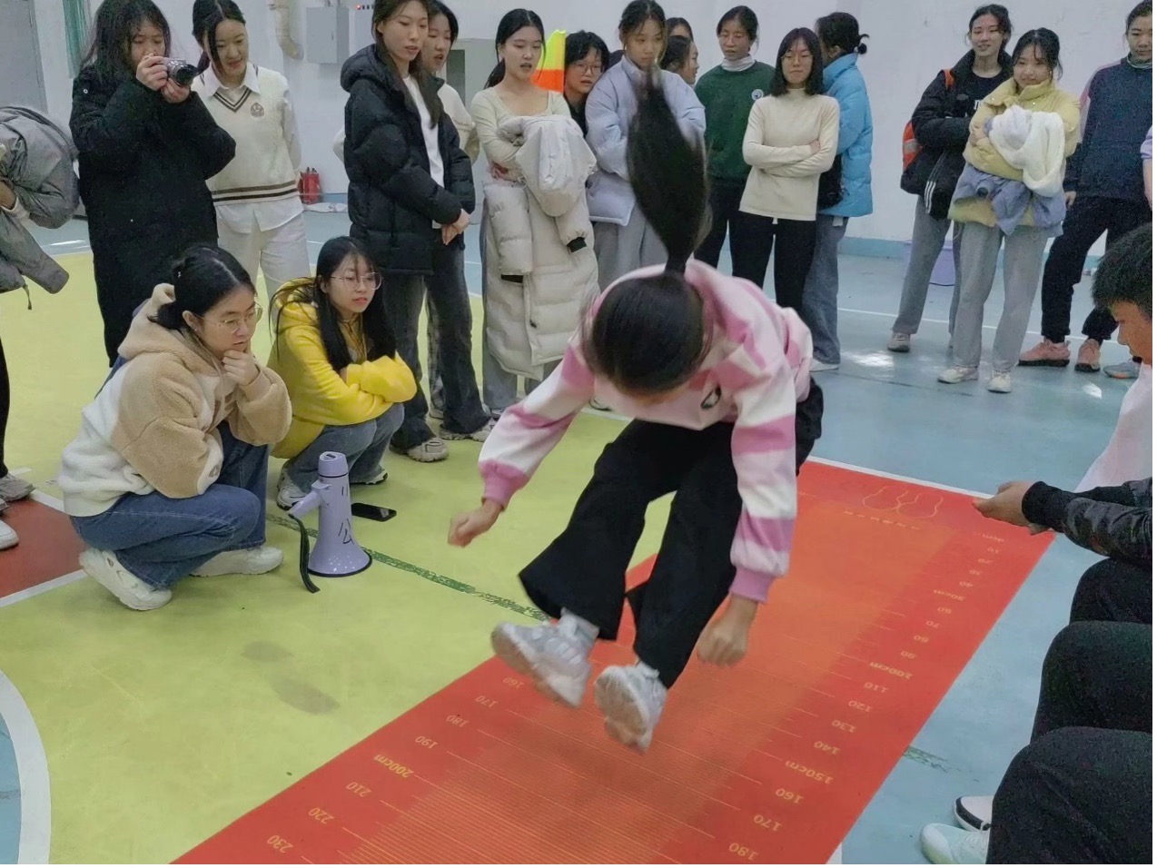 比赛开始时,选手们展现出了沉着冷静的态度。她们依次登场,准备好迎接挑战。沉着凝神,压肩、摆臂、蓄力、蹬地,纵身一跃,每一次起跳都展现出过人的力量和精湛的技巧。在空中,她们如飞燕翩然划过,弧线优美,轻盈落地。教育学院学子的加油助威声与观众们的欢呼喝彩声此起彼伏,整个场馆被热情点燃,现场氛围被推向高潮。