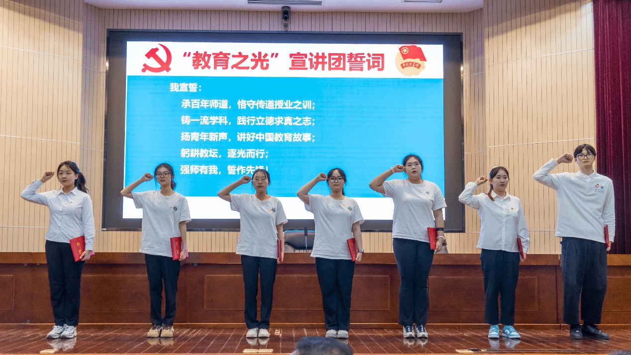 一纸聘书,承载着荣誉,更肩负着责任。“教育之光”宣讲团成立仪式上,秦恒、苏晓刚为匡已聪及宣讲团成员代表颁发聘书。在匡已聪的带领下,宣讲团全体成员、学生党员代表及“润心工程”学员代表共同庄严宣誓。铮铮誓言彰显教育精神,青春活力见证责任担当。