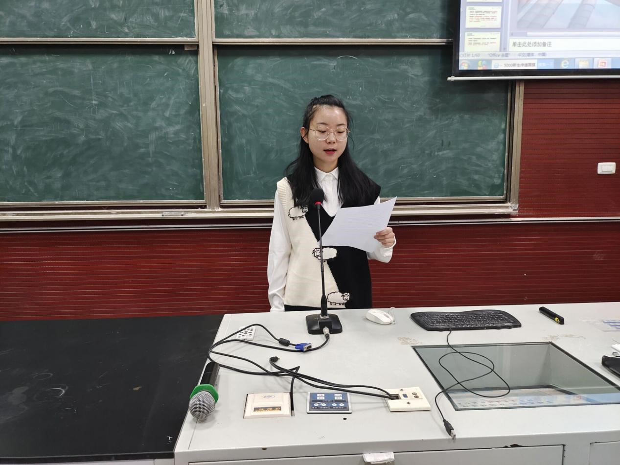 活动伊始,周丹简要介绍了活动内容。本次活动主要由普通话测试基本概况、普通话测试流程、普通话测试的应试技巧、化学课堂教师语言四部分组成。首先,周丹简要介绍了普通话等级测试的相关规定及对应要求。她在讲解考试内容时说:“考试评分标准,包括语音标准程度、词汇语法规范程度、自然流畅程度三个方面,这些都是很重要的。”并就作品片段进行了朗读示范。