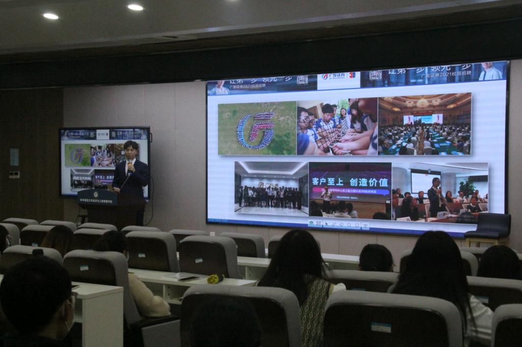 首先,广发证券的宣讲人简单介绍了公司的理念和公司员工的团建活动等,其有趣丰富的活动内容吸引了同学们的注意。广发证券此次春招主要面向金融相关专业的同学,宣讲人也就薪资福利等问题向同学们做了详细的介绍。