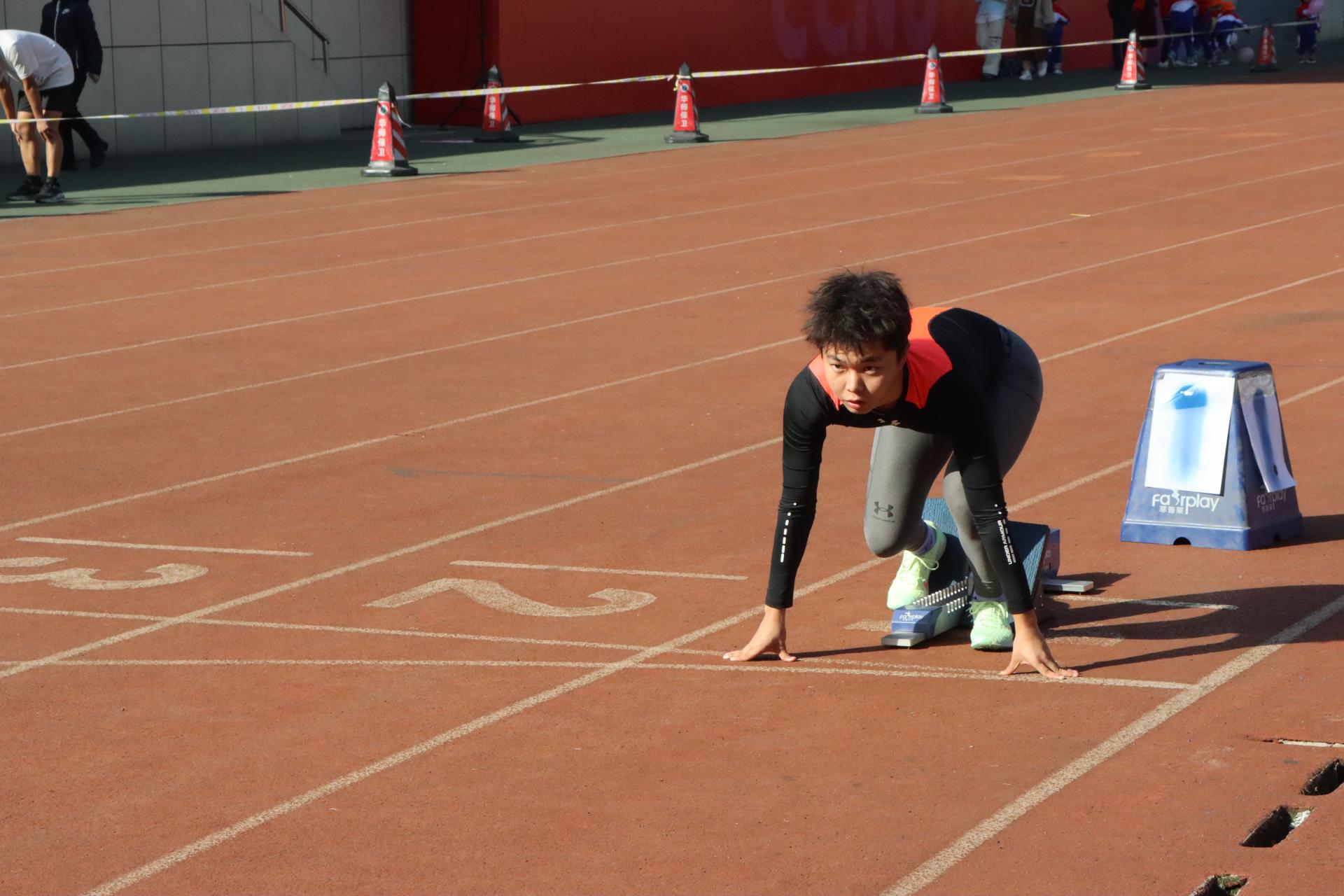 男子100米赛前,计算机学院的运动员们早早候场热身,做好压腿、拉伸以及尝试起跑等赛前准备,积极主动调整心态,争取以最佳的状态备战即将到来的比赛。比赛一触即发,在发令枪枪声响起的那一瞬,位于第二组第一道的杨彦辉立刻出发。他紧握双拳,奋力挥臂,全力以赴。面对实力强劲的同组选手,第八组的肖振豪、第九组的韩金狄和第十组的姜高峰选择迎难而上。最终,肖振豪、韩金狄、杨彦辉均取得各自小组第三名的好成绩。