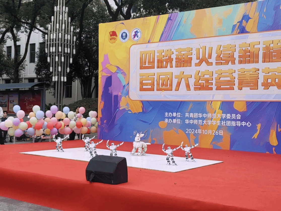 受主办方邀请,机器人协会(学生)参加了本次“百团招新”的开幕式。七台机器人在歌曲《龙》的伴奏下翩翩起舞,伴随音乐的律动做出优雅的舞蹈动作,展示出惊人的协调性与节奏感。随着每一个旋转和跳跃,现场观众纷纷被吸引,阵阵掌声不断响起。