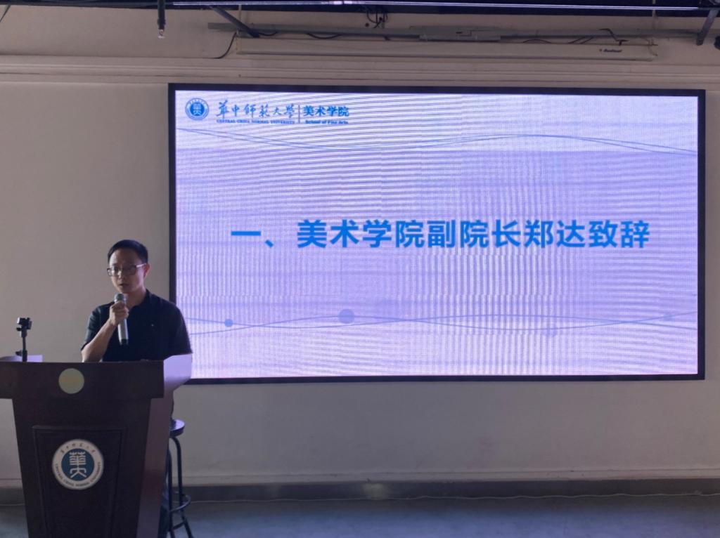 活动第一项,美术学院副院长郑达为新生发表致辞,郑院长从艺术的两种美去阐述同学们作为一名美术生应该有的品质。郑院长提出艺术的第一种表达是“优美”,代表着同学们需要和谐安静,对于一切能够坐怀不乱,对于一切能够运用自如。随后就提出艺术的第二种表达是“壮美”,这代表着稳重与无畏。郑院长在举出艺术的优美与壮美带来的精神之时,同时提出艺术在人类欲望中体现出来的力量,也呼吁同学们要创造面向艺术圈的艺术,更是要创造面向世界和未来的艺术。郑院长强调到:“同学们应该致力于美育大循环的系统构建,通过创造和批判,不断激发自身的情感能力和艺术自信力。”最后郑院长赋诗一首,从中表达对21级新生的祝福和未来的期待。