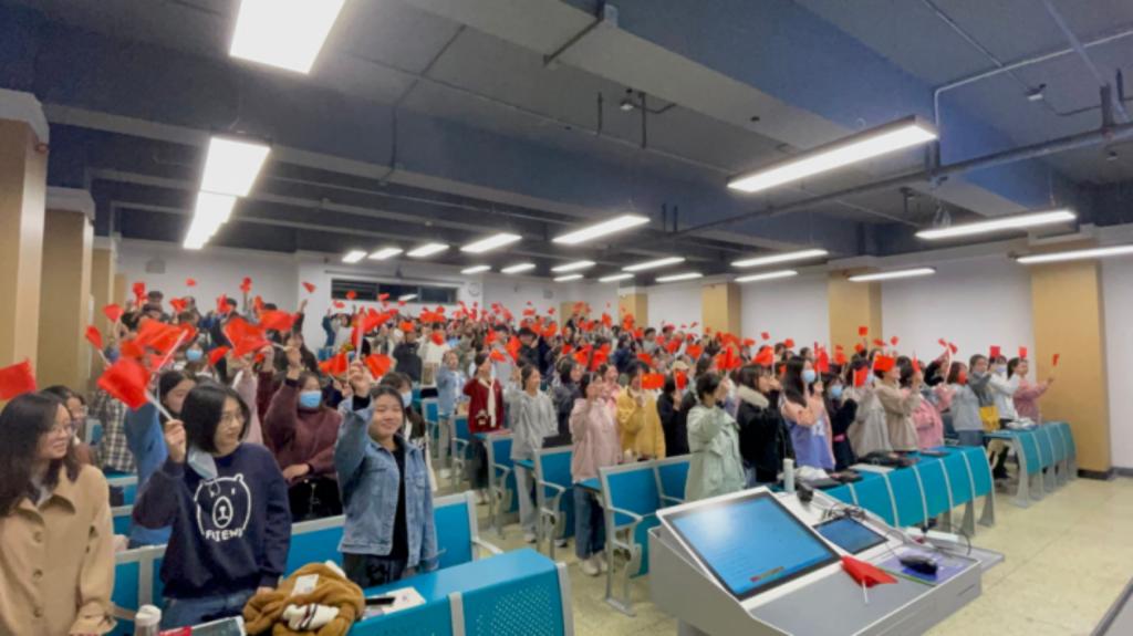 在辅导员高瑞阔老师的带领下,美术学院2021 级同学全体起立,齐唱《没有共产党就没有新中国》。“没有共产党就没有新中国,共产党辛劳为民族,共产党他一心救中国……”同学们手举红旗随着歌曲的节奏摇摆,歌声铿锵有力,慷慨激昂,在放声歌唱的同时,中国共产党自成立以来给中国带来的翻天覆地的变化也一一浮现于同学们的脑海中,每位同学脸上都洋溢着自豪的笑容。