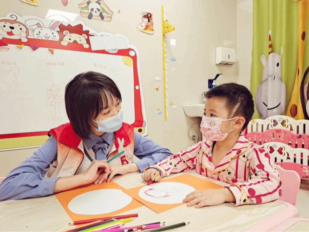 随后两名志愿者为患儿们开展儿童画课程,尊重并肯定每一位小朋友的奇思妙想,鼓励孩子们大胆表达自己。志愿者们的悉心关怀与耐心引导充满了整个课程,现场互动的形式使小朋友们学习美术的同时乐在其中。通过折纸课程激发孩子们对本次活动的兴趣,后续又由三位志愿者积极引导孩子们绘画,用耐心温暖的话语不断地鼓励孩子们进一步完成作品,并在结束时充分肯定了孩子们的表现,让患儿们喜爱美术的同时更加自信。