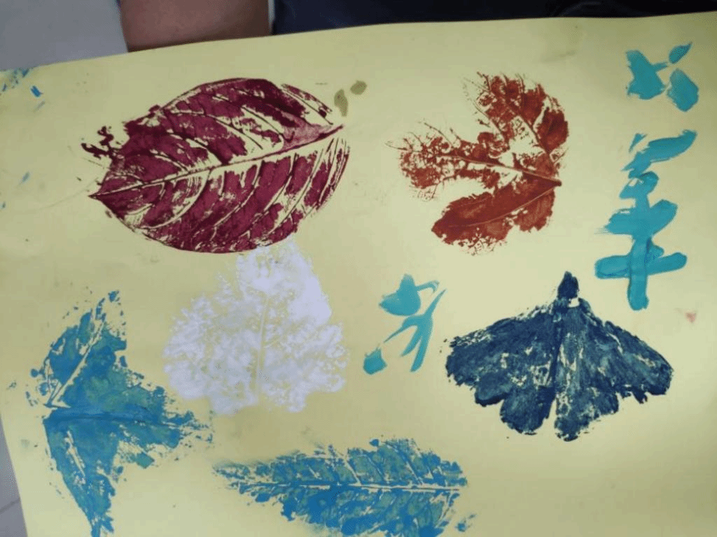 走近秋天,秋叶之美。对于年龄较小的患儿,两位志愿者还额外开展了“秋叶之美”的活动。她们带领小朋友们在病房外安全的开阔草坪寻找自己心仪的落叶,将叶片收集带回课程活动室后引导孩子们将叶片作为“印章”,在叶子的正面涂上喜欢的颜色当作印泥并在彩纸上印上一个个美丽的图案。活动过程中时不时传来孩子们和志愿者的欢笑声,“秋叶之美”的活动让孩子们敞开心扉,秋日的明媚更是随着声声欢笑照亮了病房内每一个人的心灵。