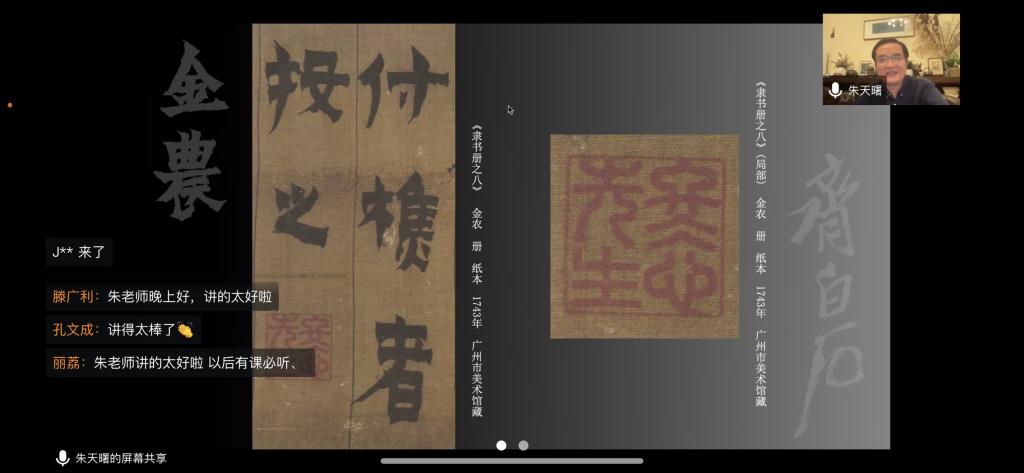 华大青年讯(通讯员 谌倩)5月23日晚,中国书法家协会理事、北京语言大学中国书法篆刻研究所所长、中央美术学院特聘教授、博士生导师朱天曙应华中师范大学美术学院邀请,开展题为“渊源与变法:以齐白石师法金农为例”专题讲座,此次讲座由华中师范大学美术学院教授杨贤宗主持,以线上腾讯会议方式进行,学院本科生、研究生400余人在云端参与学习了本次讲座。